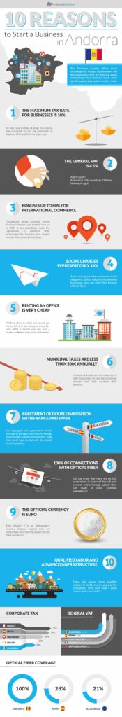 With this infographic, ANDORRE INVEST introduces you the reasons why it’s more and more interesting to start a business in Andorra and establish your tax residence there. We give you 10 reasons which will convince you to invest in Andorra and benefit from its tax system.